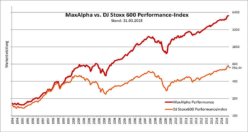 Die abgebildeten Performanceergebnisse stellen den Verlauf des MaxAlpha Ansatzes, jeweils getrennt nach Europa (mit Währungsanteil) und Euroland (ohne Währungsanteil) dar.